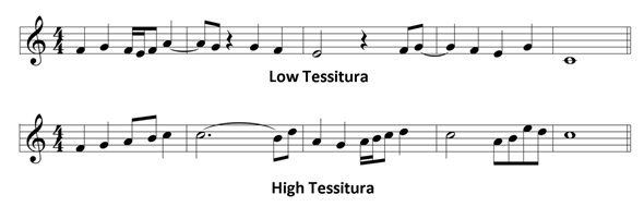 Two songs may have the same general range but different tessituras, as shown in this example [Figure 1]. There are some singers who can sing both of these tunes comfortably; there are others who can handle the range without any problem, but who find the tessitura of the second tune very demanding because it lies so high within the octave. (p. 111)
